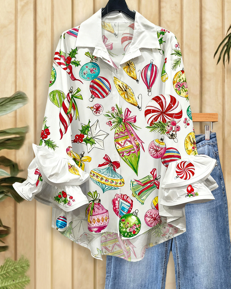 Festive Christmas print button-up with rocking ruffle sleeves, perfect for holiday parties and joyful celebrations.