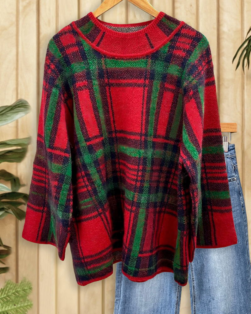 Stylish plaid sweater with mock neck, perfect for cozy everyday wear.