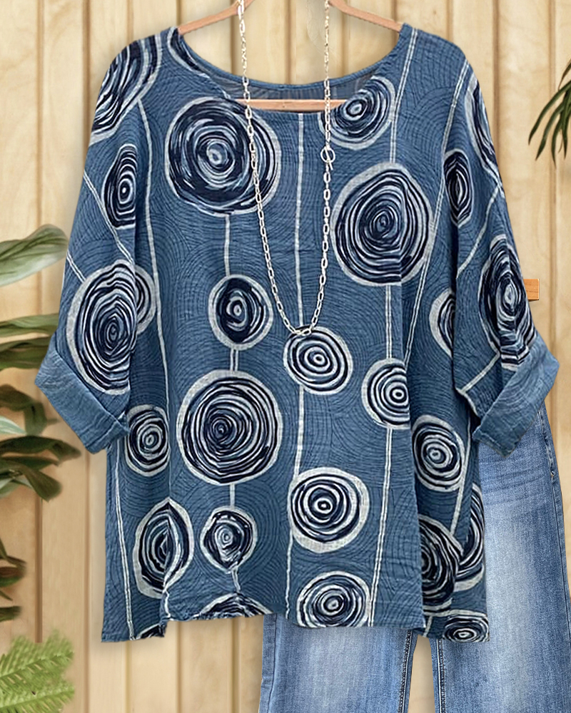 Pastoral abstract print blouse with round neck, perfect for calm countryside vibes.