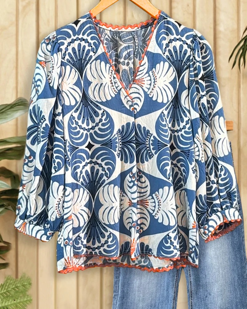 Mint Boutique Abstract Print Retro V Neck Scalloped Trim Blouse