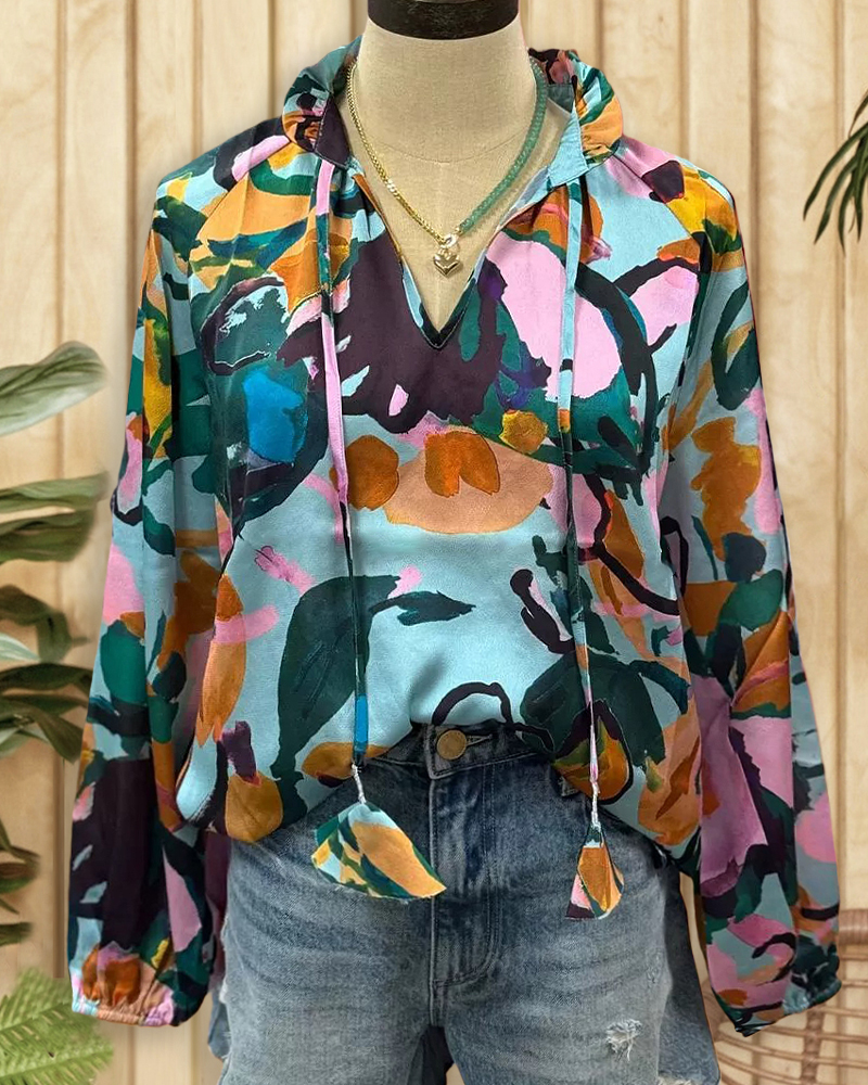 Modern tie-neck blouse with abstract watercolor print, perfect for chic office or daily wear.
