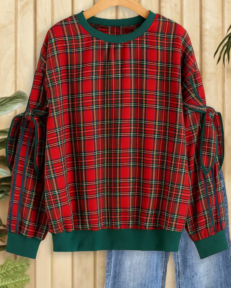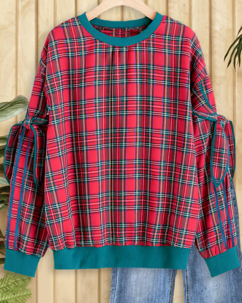 Smart round-neck sweatshirt with bow decor and plaid design, perfect for casual chic wear.