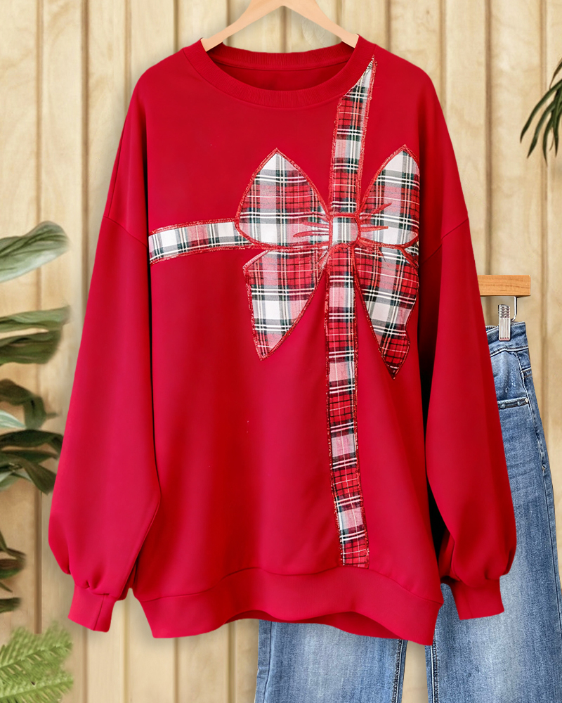 Preppy round-neck sweatshirt with bowknot detail and drop shoulders, perfect for cute casual wear.