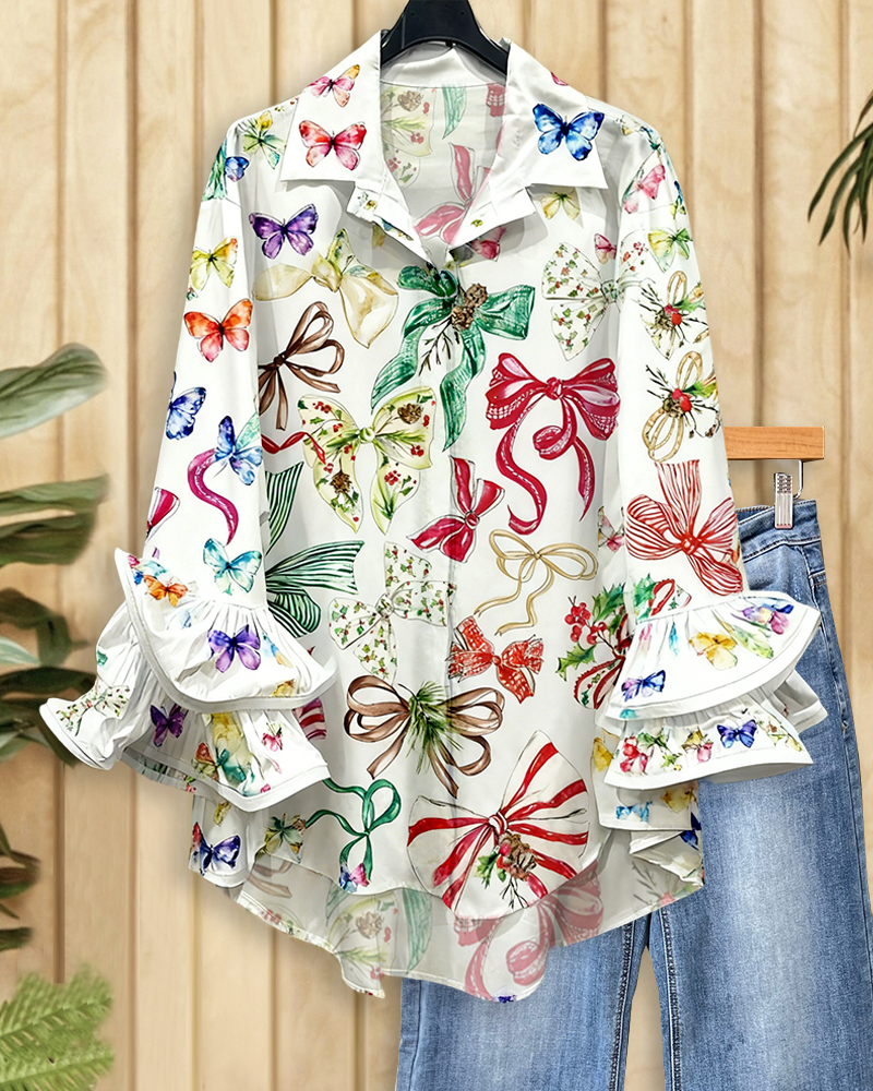 Stunning bowknot print blouse with ruffle sleeves, perfect for parties, dates, and stylish everyday wear.