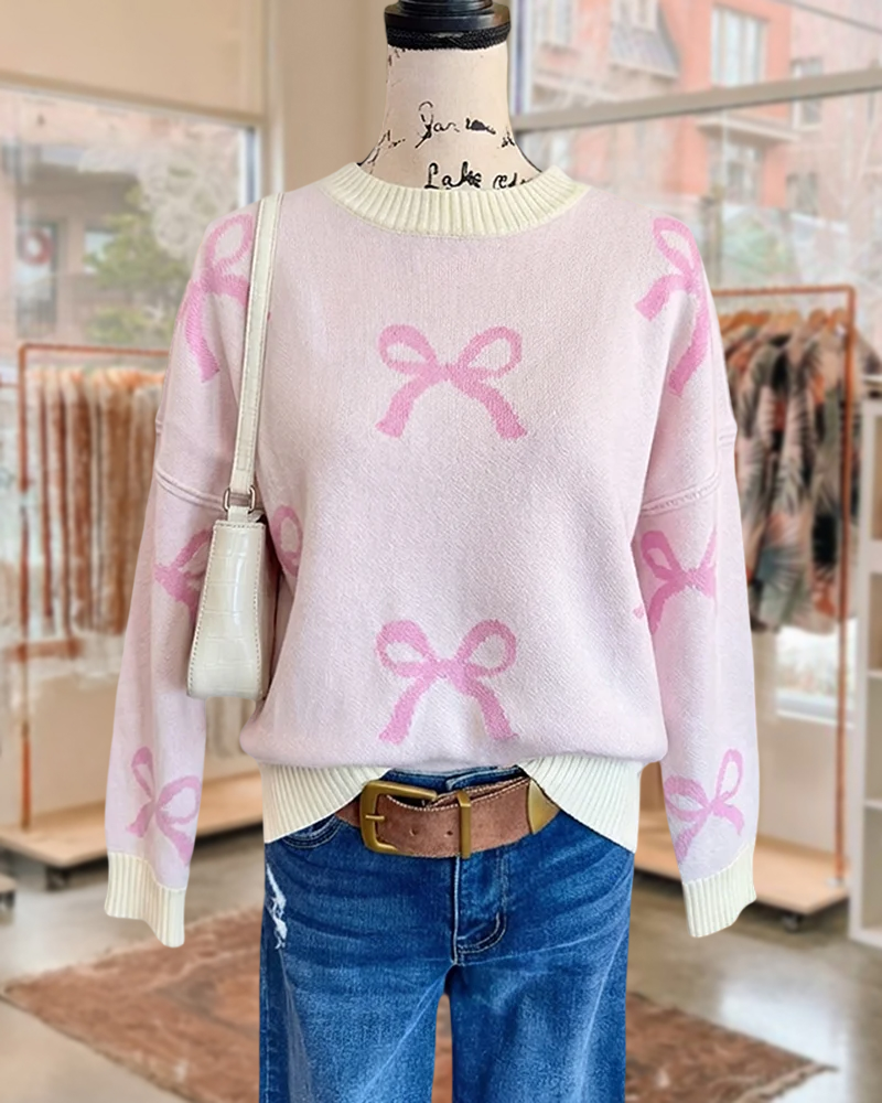 Bowknot round neck sweater with drop-shoulder fit, perfect for pretty casual wear.