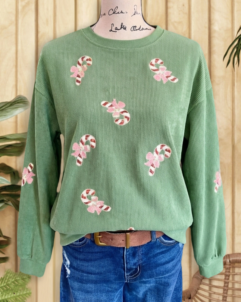 Cute ribbed candy cane sweatshirt, cozy for festive days and cheerful casual outings.