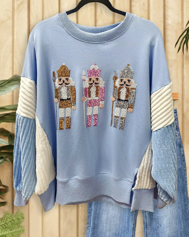 Cozy blue sweatshirt with sequin nutcracker trio and textured sleeves, festive and cute for everyday wear.