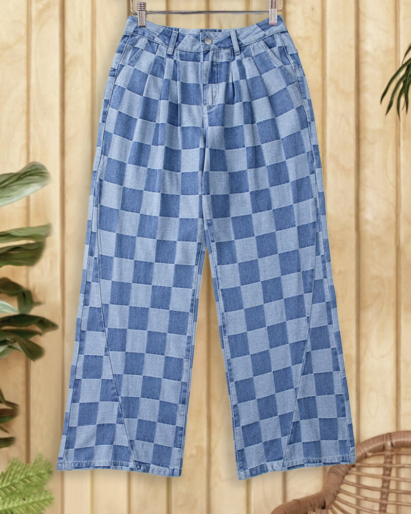Stylish checked print wide-leg jeans, perfect for trendy and relaxed everyday outfits.