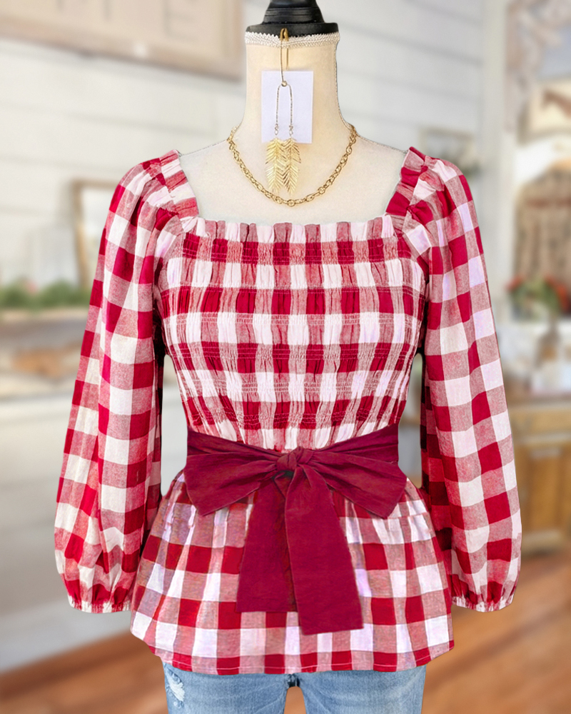 Mint Boutique Checked Square Collar Girly Lace-Up Peplum Blouse
