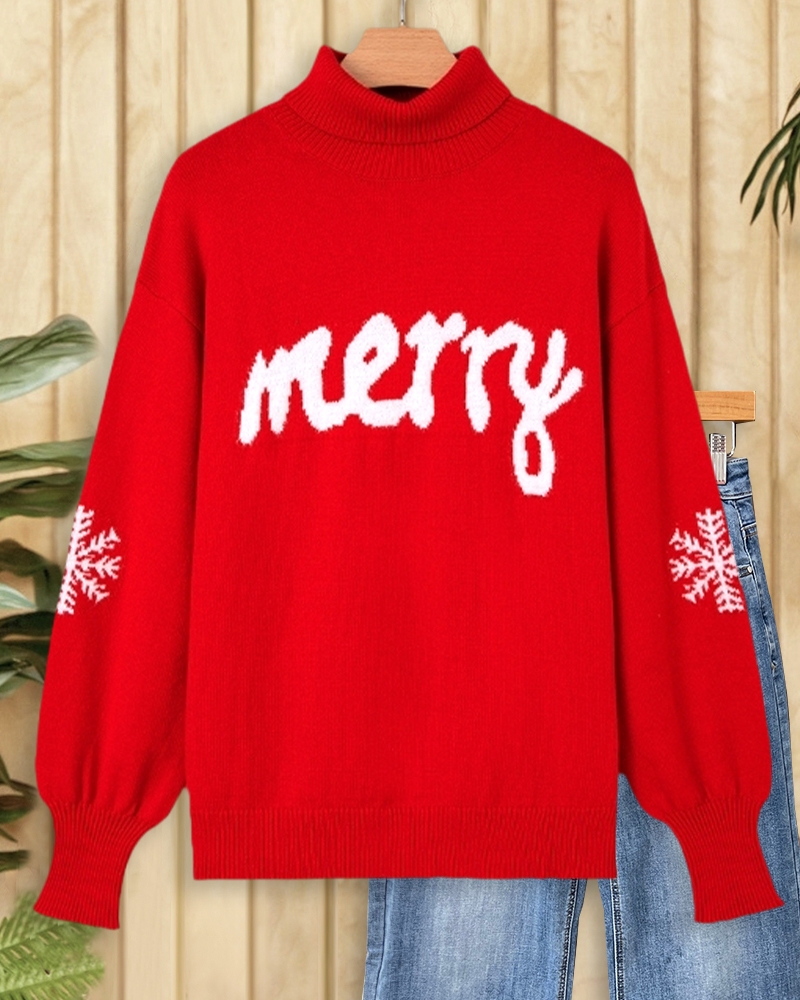 Chic turtleneck sweater with Christmas letters and snowflake print, perfect for festive parties and cozy winter wear.