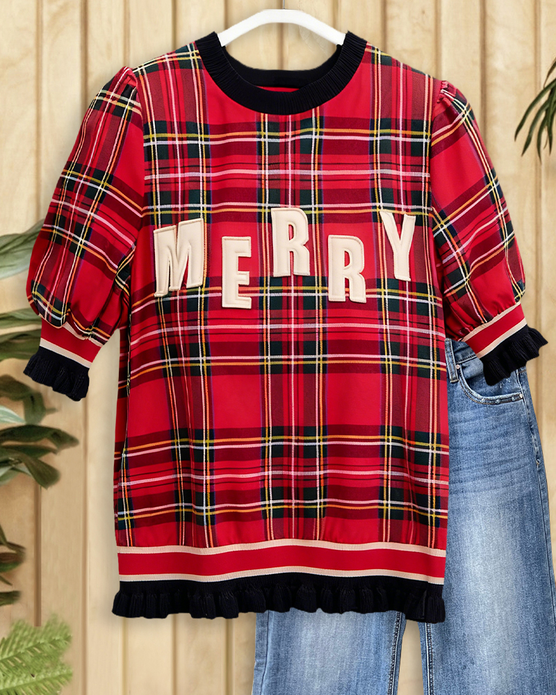 This festive red plaid top features 3D "MERRY" lettering, puff sleeves, and ruffled trims. Perfect for Christmas gatherings—vintage, cheerful, and holiday-ready.