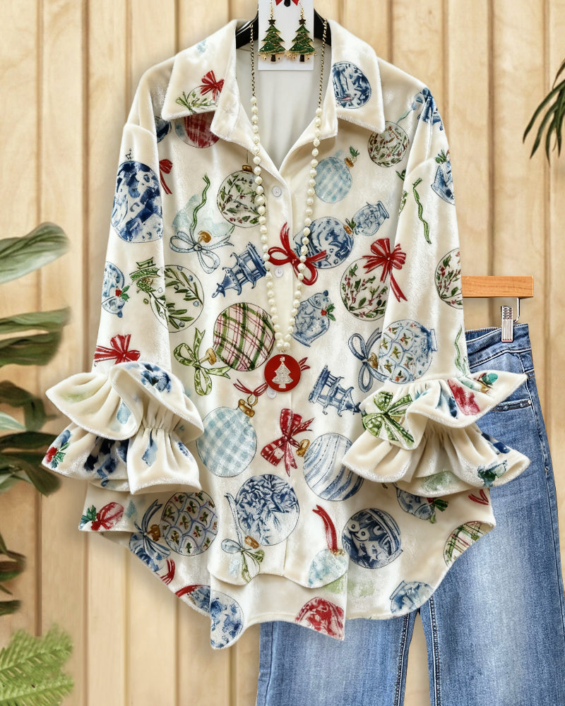 Elegant velvet Christmas blouse with ornament print and ruffle sleeves, perfect for festive parties and holiday gatherings.