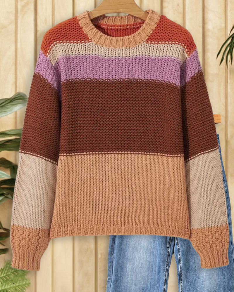 Simple color block sweater with round neck and drop shoulders, ideal for relaxed everyday wear.