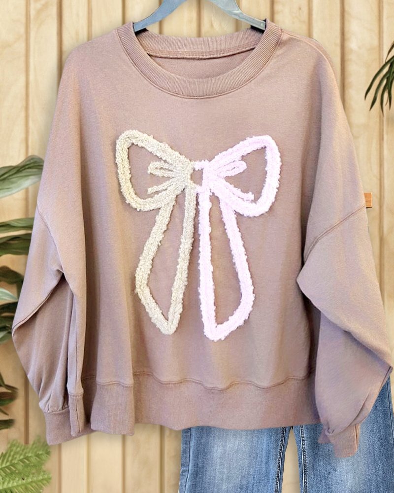 Stylish round neck sweatshirt with colorblock and bow applique, perfect for casual everyday wear.