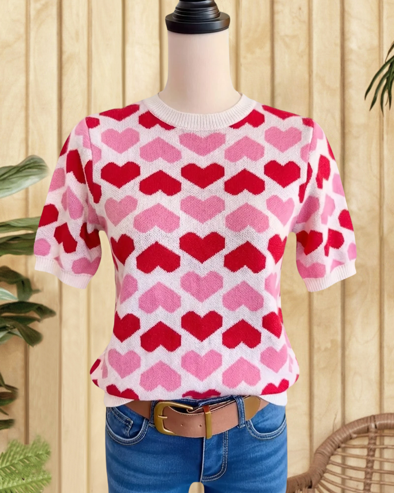 Girly crew neck sweater with contrasting heart graphic, ideal for cute casual looks.