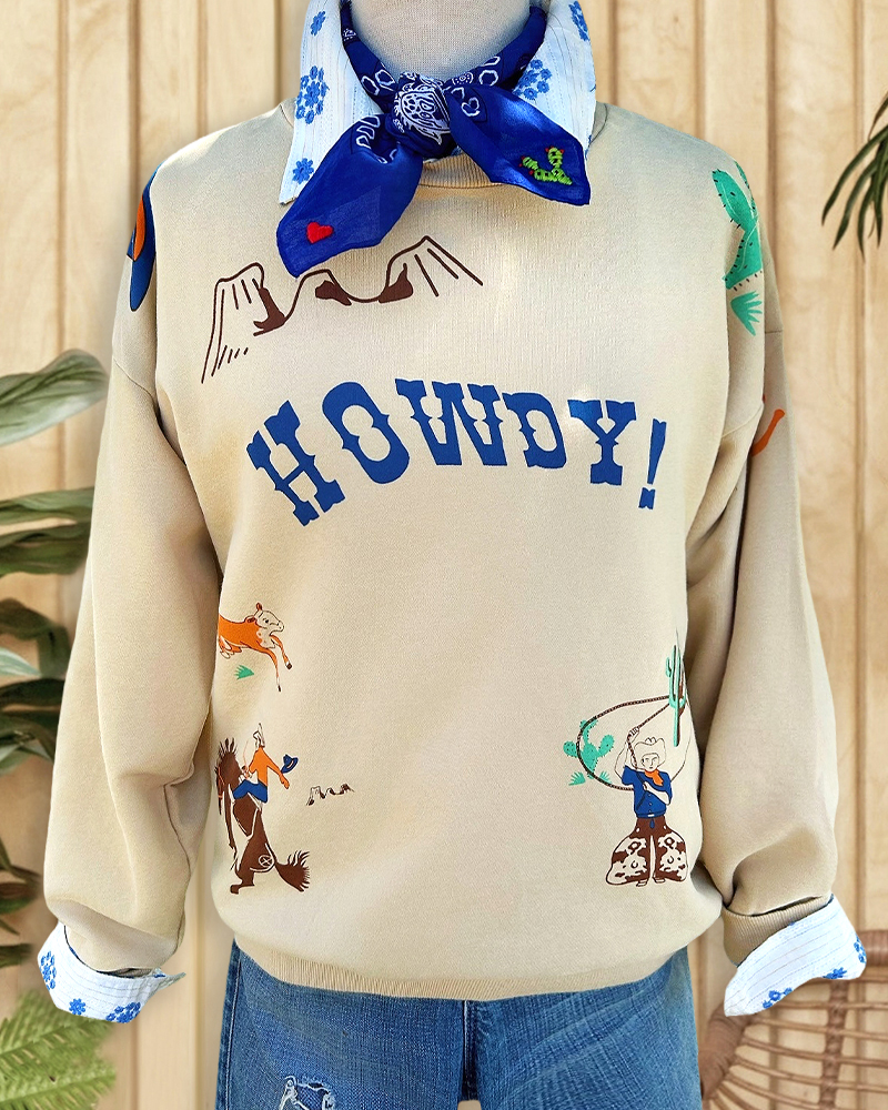 Mint Boutique Cowboy Print Retro Round Neck Drop-Shoulder Sweatshirt