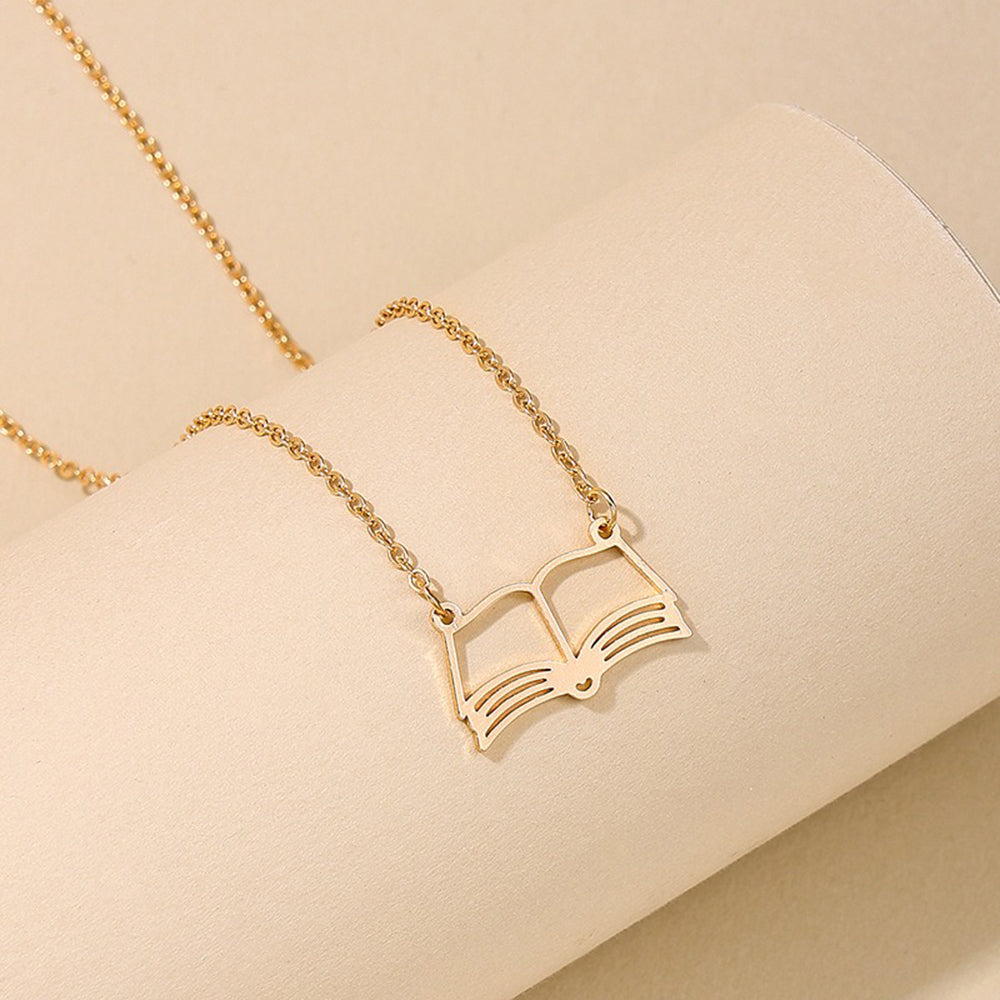 Minimalist gold-tone necklace featuring an open book pendant, symbolizing knowledge and charm, perfect for book lovers and everyday elegant wear.