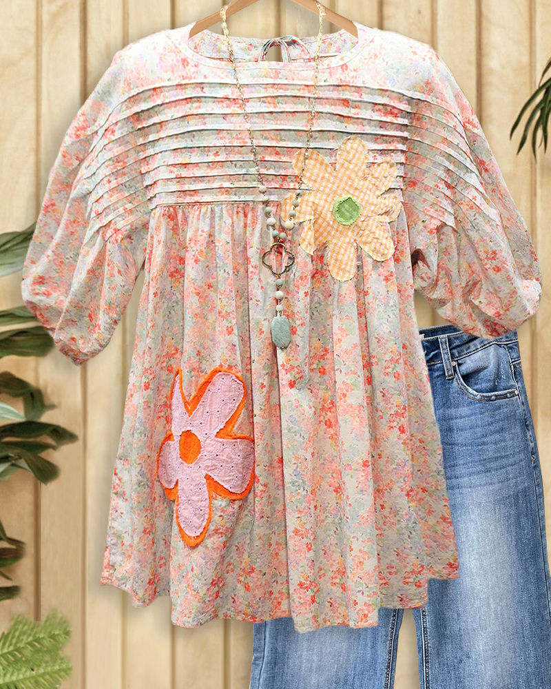 Relaxed fit with floral applique, pleats, and a comfortable round neck.