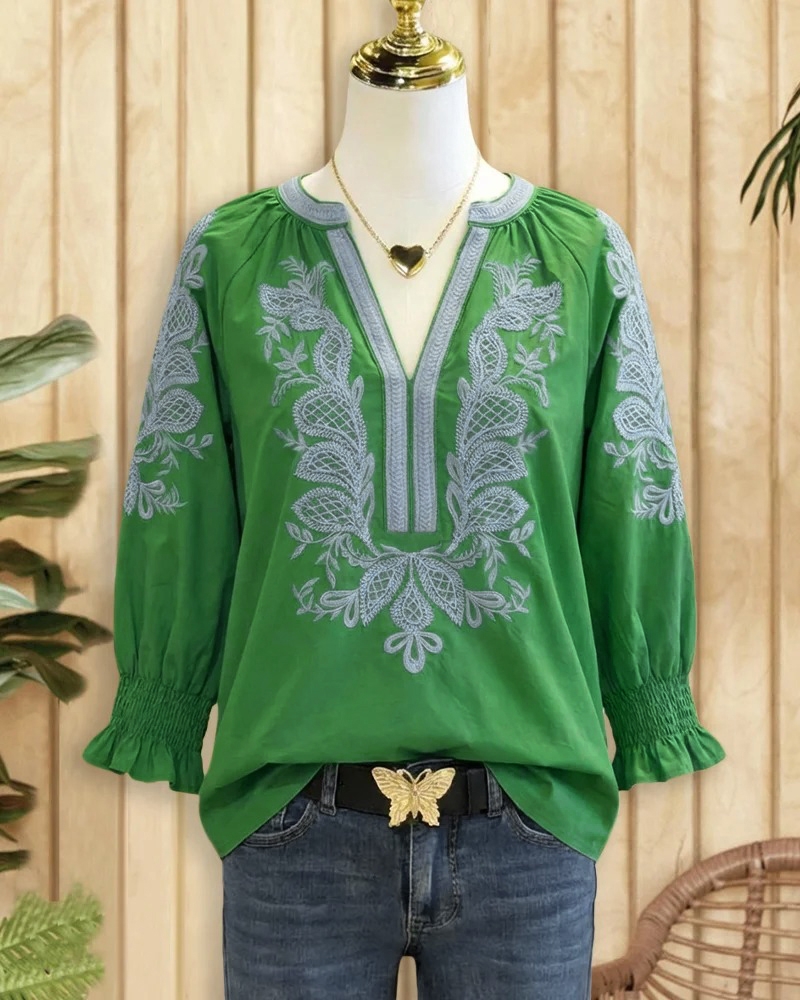 Boho V-neck blouse with floral embroidery for a relaxed, stylish look