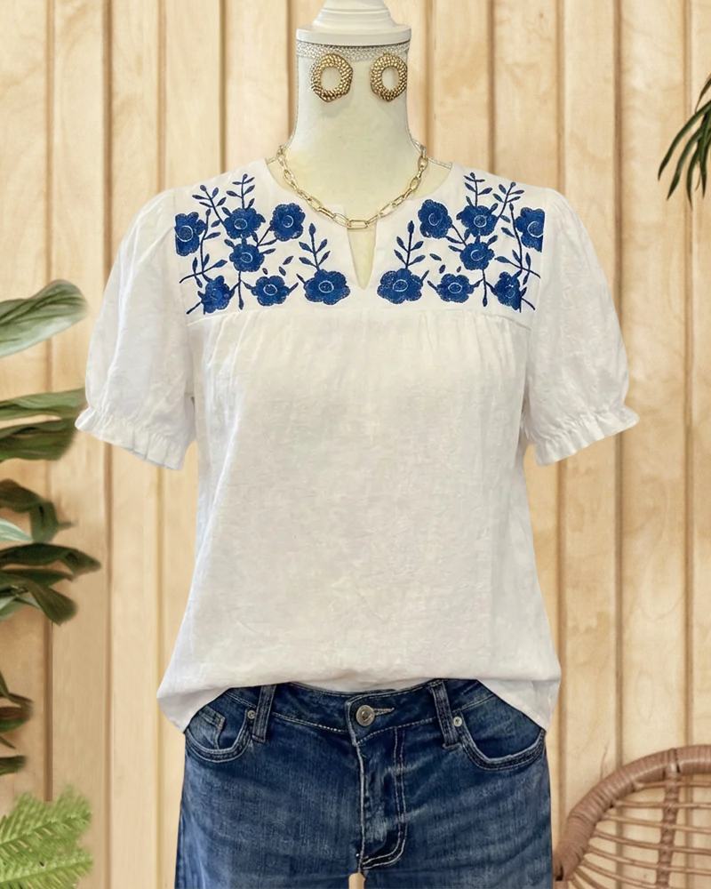 Playful blouse with floral embroidery and puff sleeves, perfect for cute outfits.