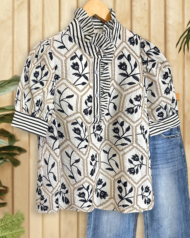 Stylish blouse with floral embroidery and a charming ruffled collar.