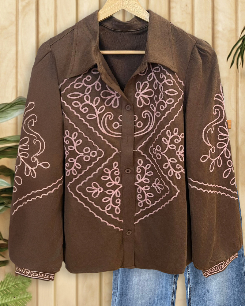 Smart blouse with floral embroidery and button front, ideal for work or casual outings.