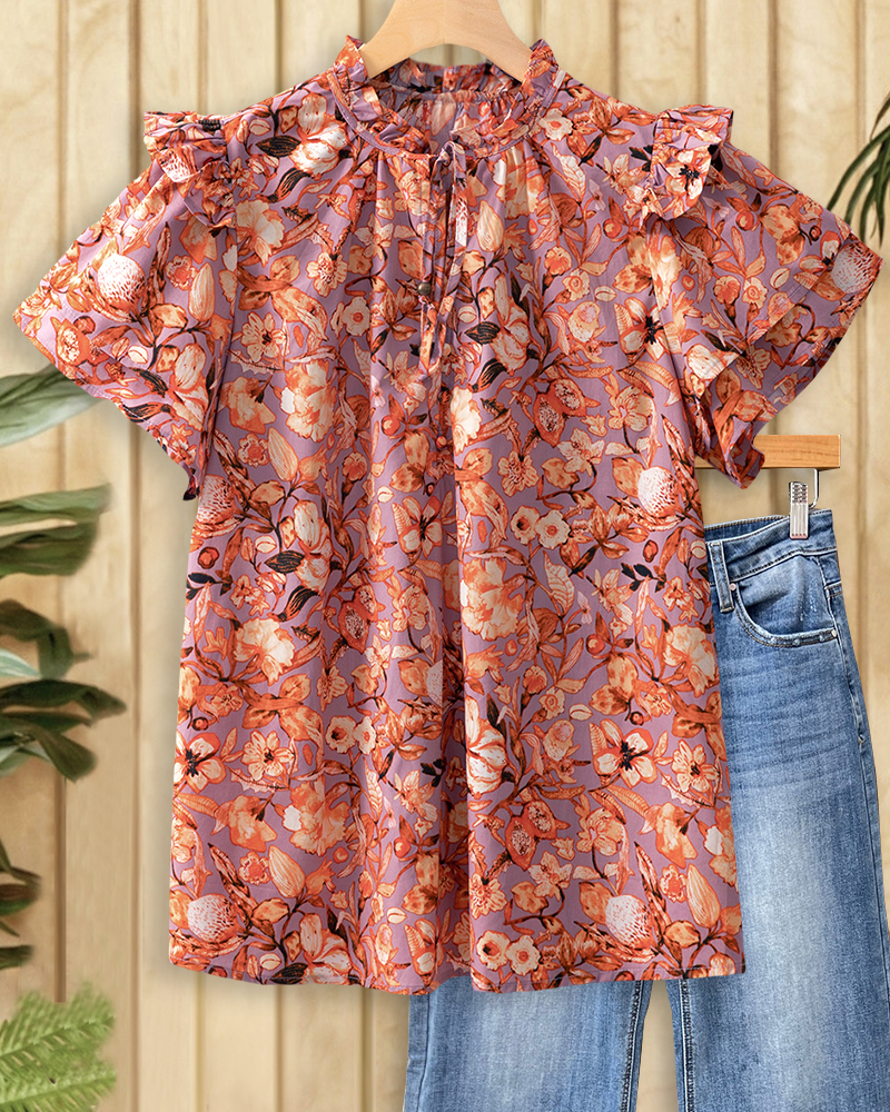 Boho floral blouse with tie neck and ruffled shoulders, perfect for free-spirited, chic days.