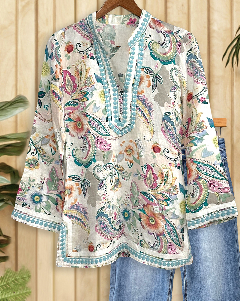 Mint Boutique Floral Print Bohemia V Neck Patchwork Blouse