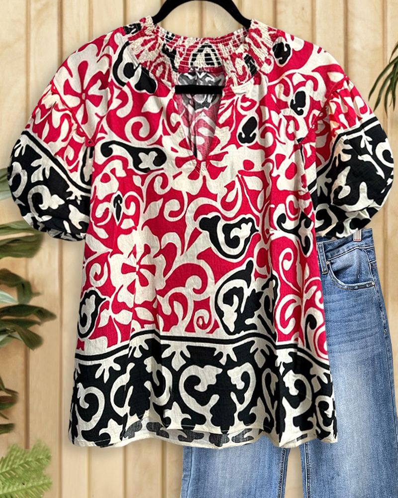Boho-style floral blouse with puff sleeves and V-neck, perfect for relaxed outings.
