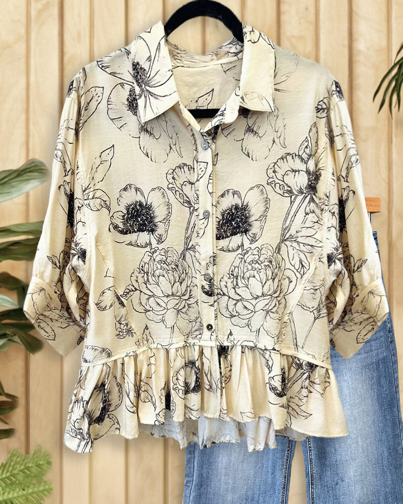 Playful floral peplum blouse with button-up design, ideal for casual charm.