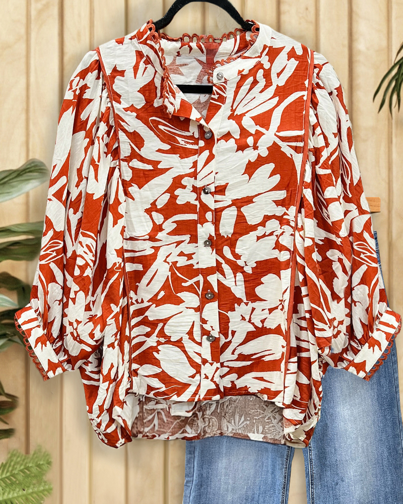 Chic floral blouse with circle trim and button-down design, perfect for casual or workwear.