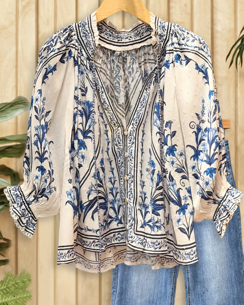 Elegant floral tee with puff sleeves and buttons, perfect for brunch or work.