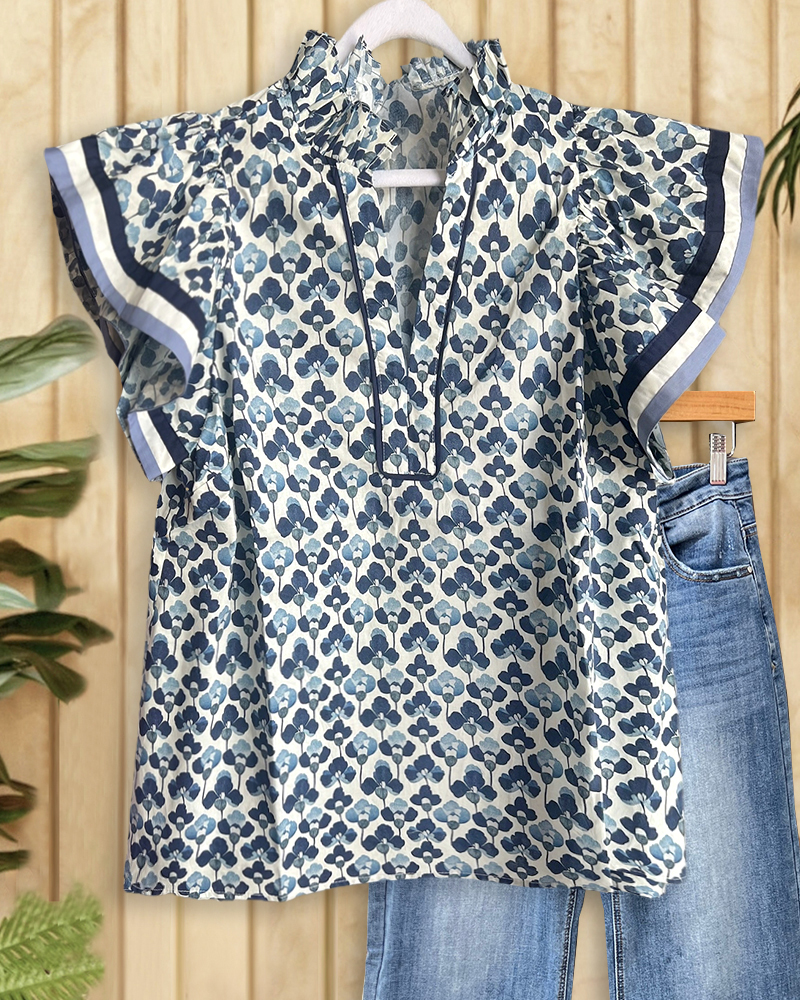Elegant floral print with ruffle sleeves and a flattering V neck silhouette.