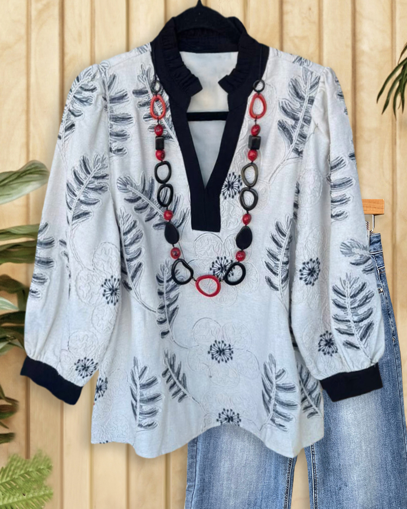 Elegant V-neck blouse with floral print, perfect for chic daily wear.