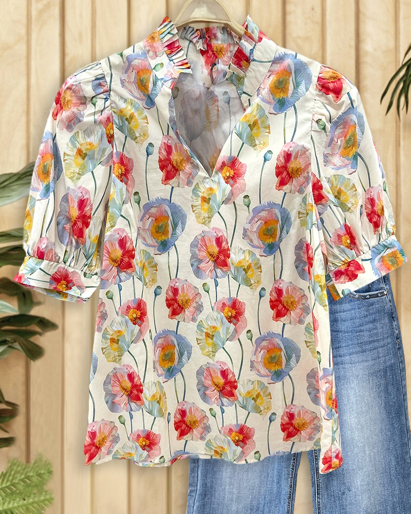Elegant floral blouse with V-neck and puff sleeves, perfect for work or dinner dates.