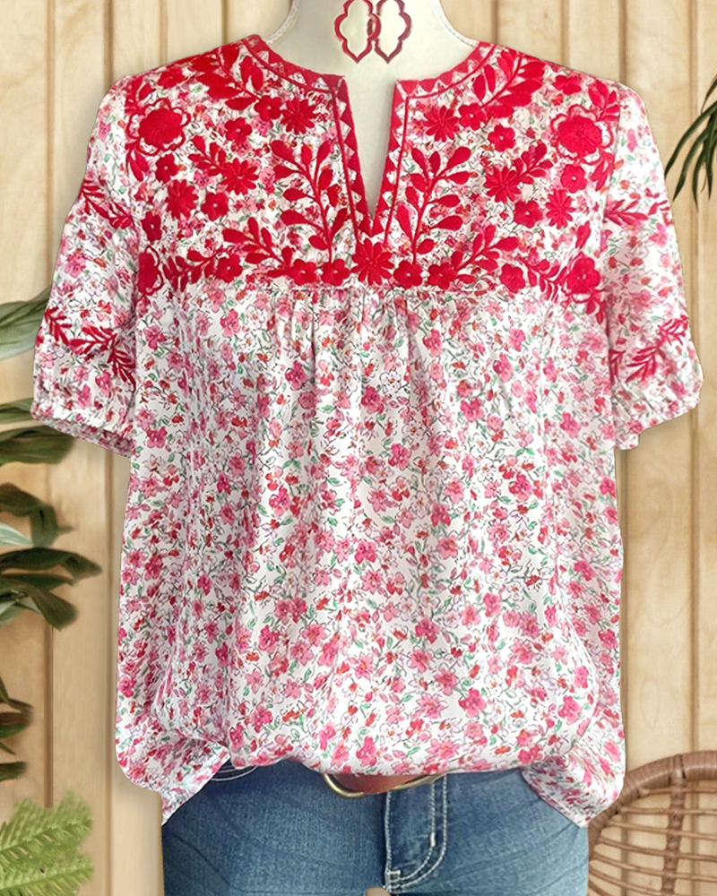 Laid-back floral blouse with embroidered V-neck, perfect for relaxed yet stylish looks.