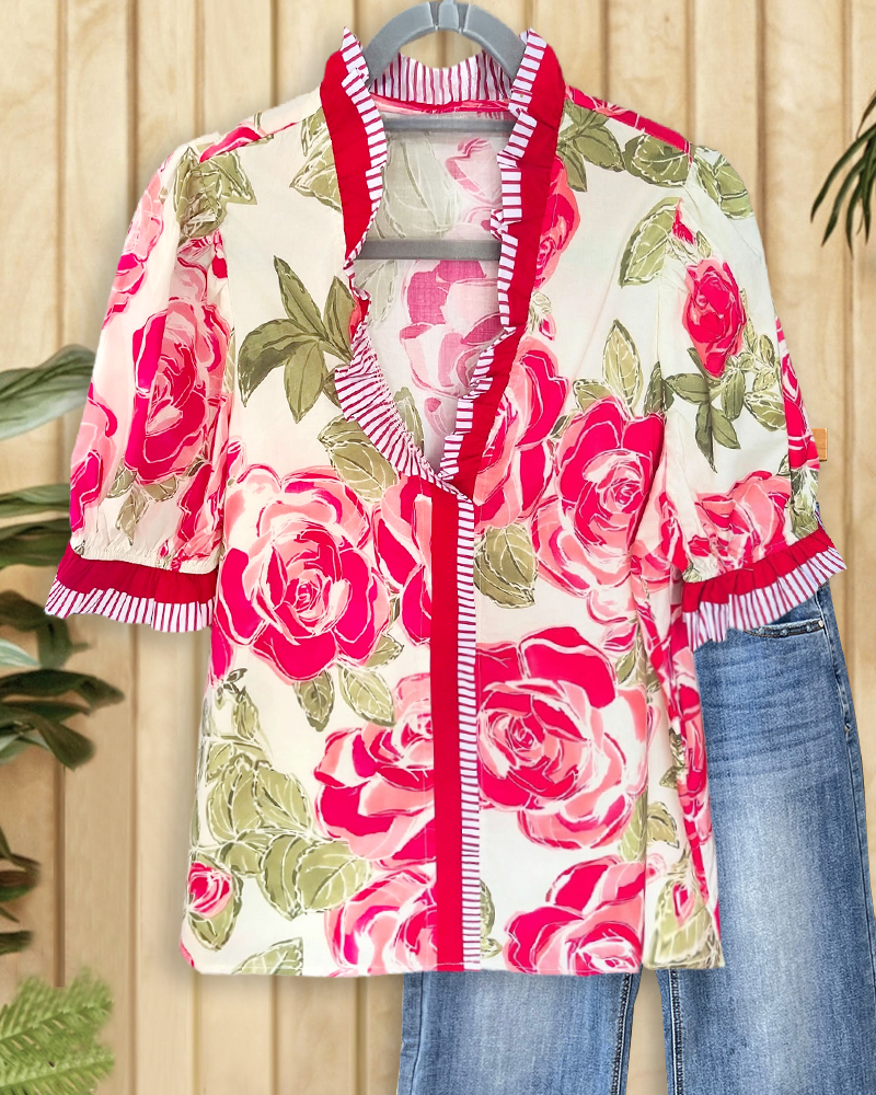 Mint Boutique Floral Print Feminine Puff Sleeve V Neck Shirt