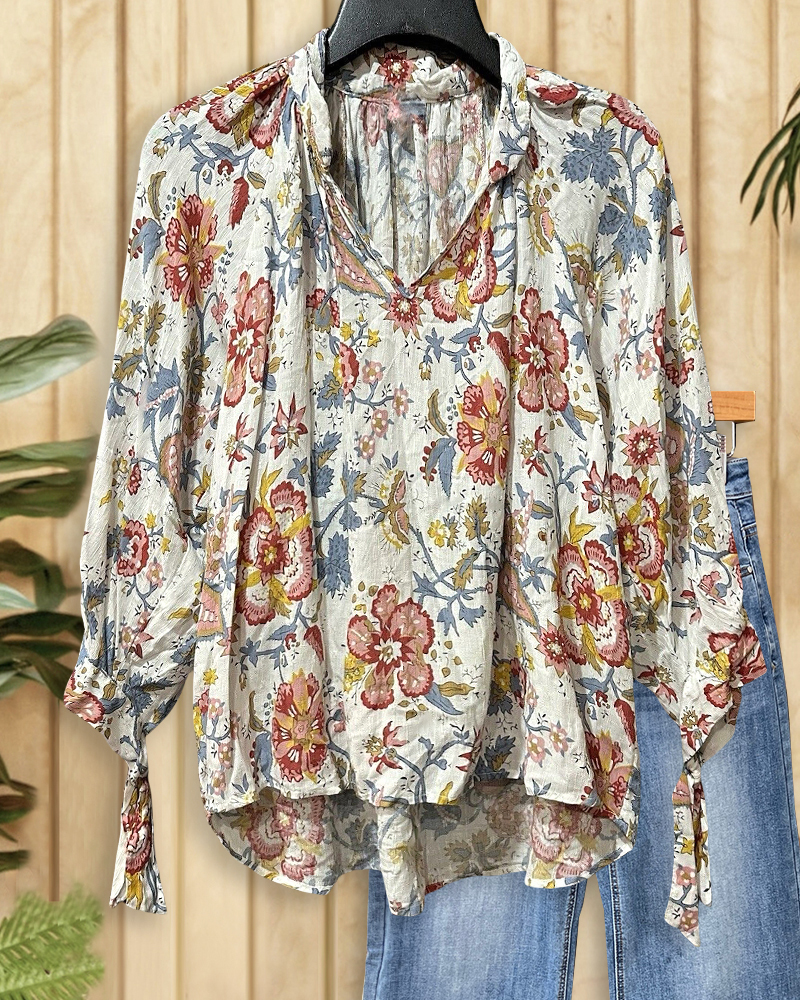Feminine V-neck blouse with floral print and tied sleeves, perfect for adding a chic and elegant touch to your look.