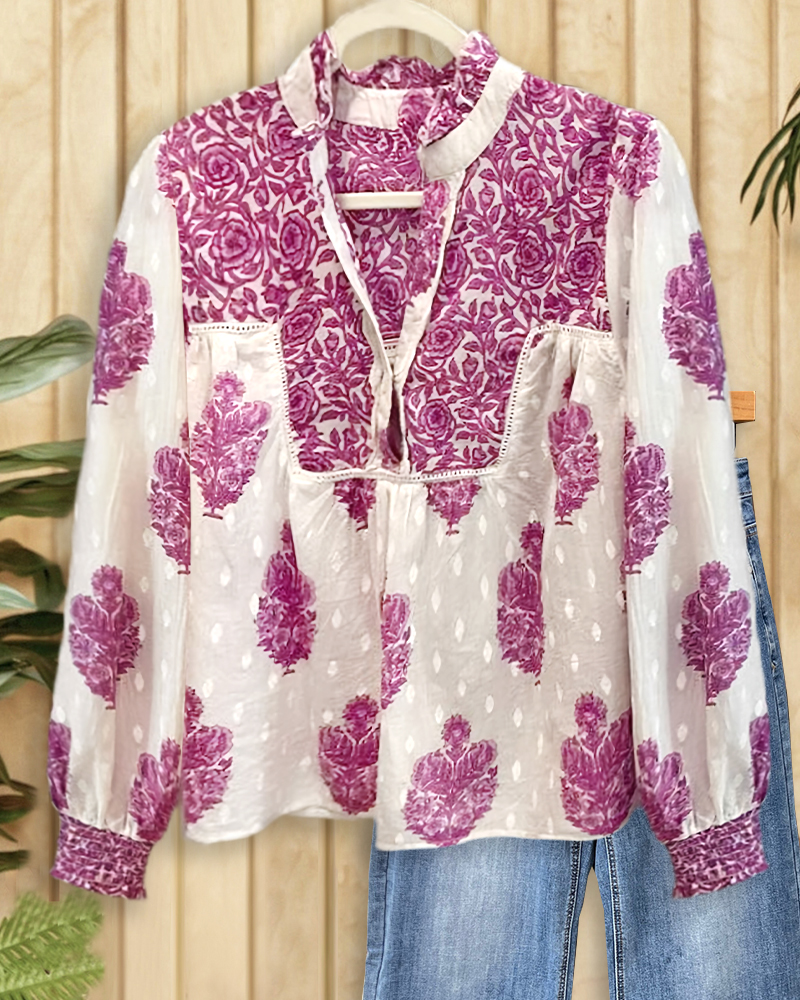 Floral Bohemian blouse with lacy inserts and split neck, perfect for casual or festival wear