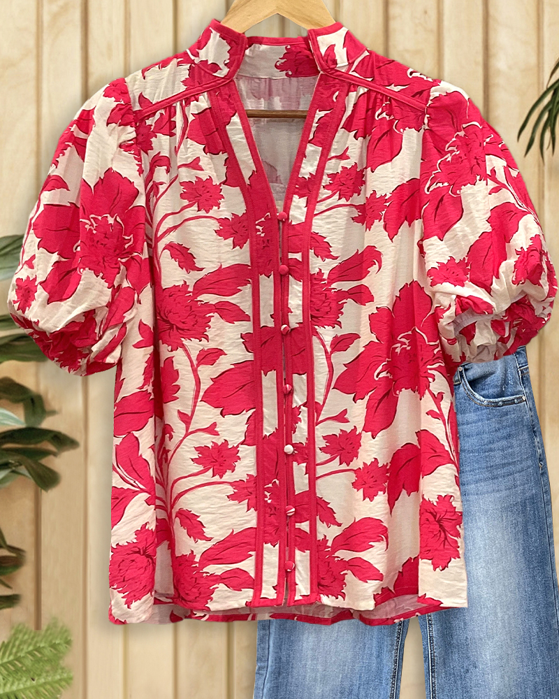 On-trend floral blouse with puff sleeves and button front, perfect for chic everyday looks.