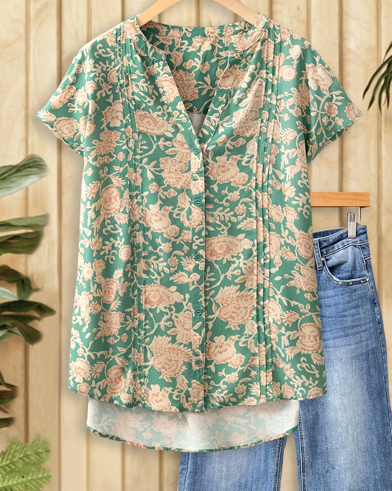 Pastoral floral button-up tee with pleats, perfect for casual charm.