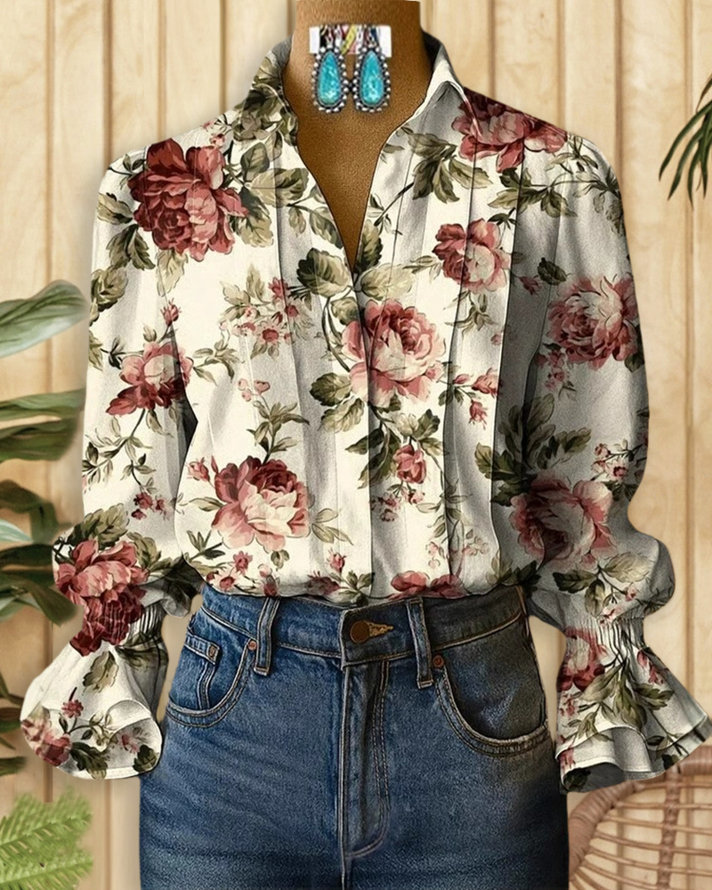Pastoral button-up blouse with floral print and trumpet sleeves, perfect for charming casual wear.
