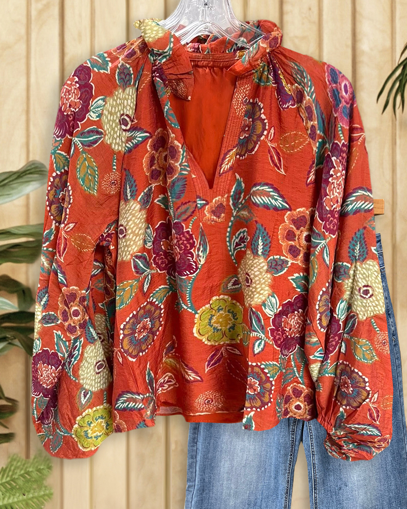 Mint Boutique Floral Print Pastoral V Neck Lantern Sleeve Blouse