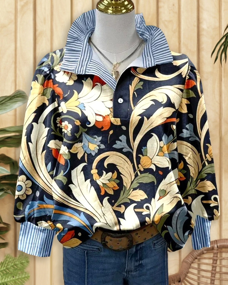 Elegant blouse with floral print patchwork, perfect for chic casual or special occasions.