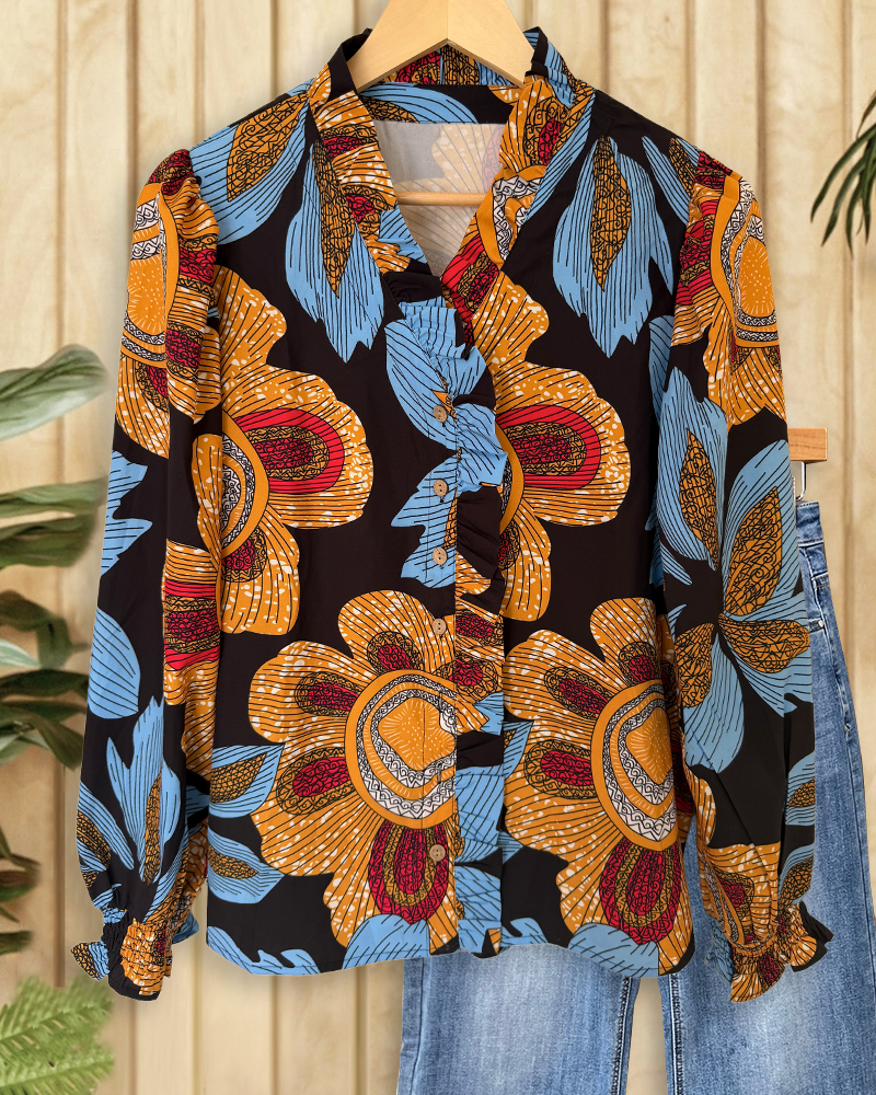 Floral blouse with ruffle trim and buttons, perfect for stylish office or commuting wear.