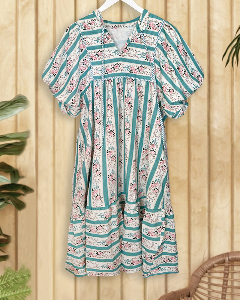 Elegant midi dress with floral and striped print, puff sleeves, perfect for chic occasions or daily wear.