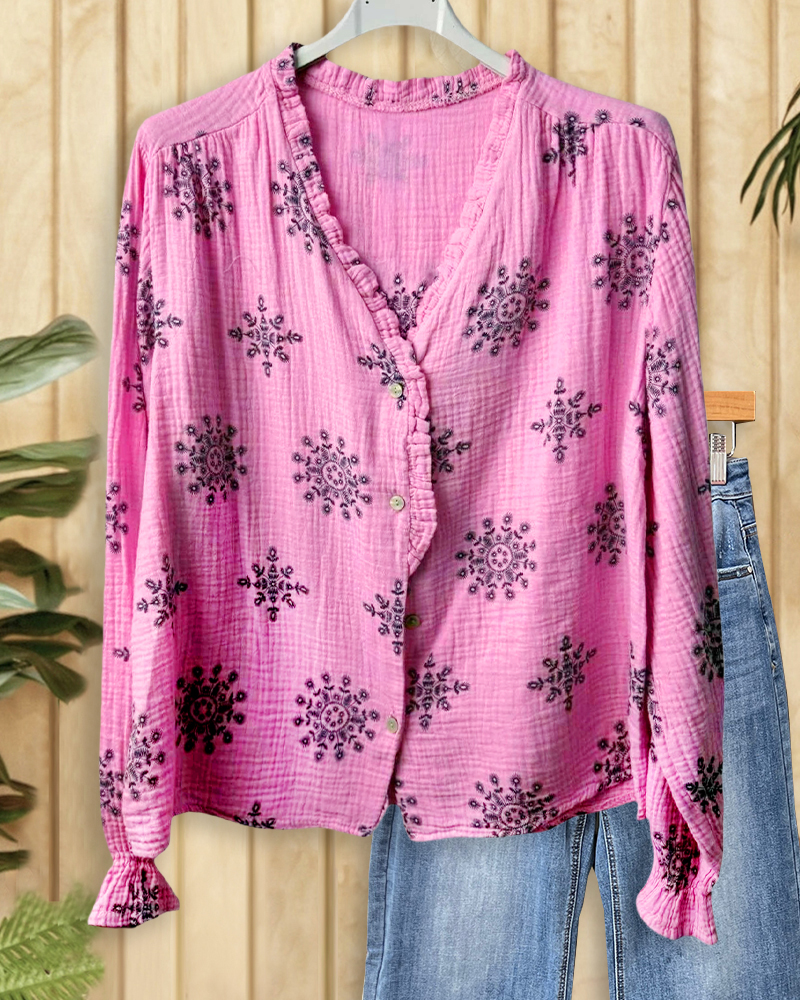 V-neck button-up blouse with floral print, perfect for commuting or smart casual wear.