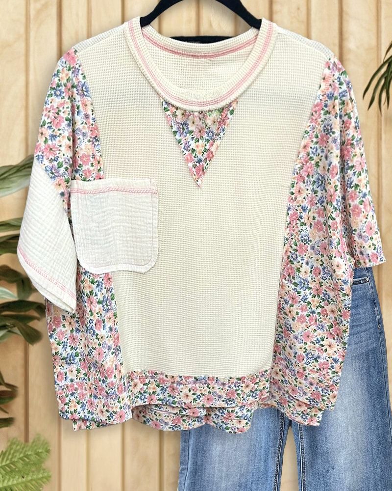 Mint Boutique Floral Print & Waffle Round Neck Unusual Shirt