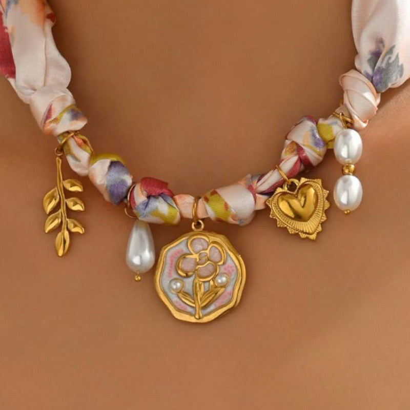 Chic fabric scarf necklace with flower and heart pendants, perfect for gifts, parties, and stylish everyday looks.