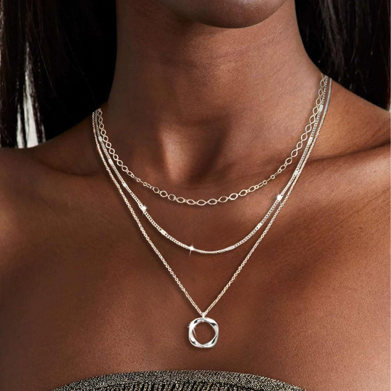 Urban multi-layer metal necklace with geometric pendant, perfect for street style, parties, and trendy everyday looks.